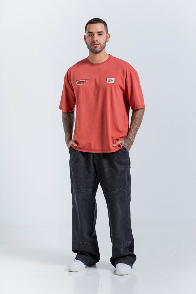 Dale fuerza a tu estilo con esta camiseta manga corta para hombre, de silueta oversized y efecto de lavandería en color terracota. El estampado y aplique decorativo frontal elevan su vibra urbana, haciendo de esta pieza de la colaboración PEOPLE X ANA LISTAS una declaración de identidad y confianza. Hecho en Colombia.